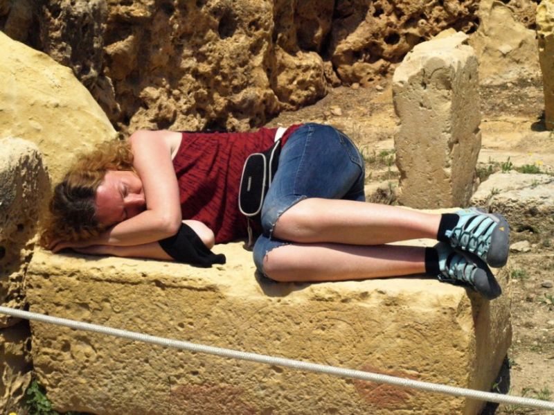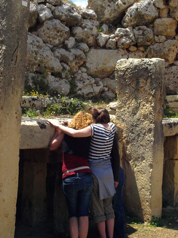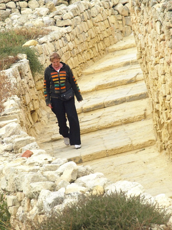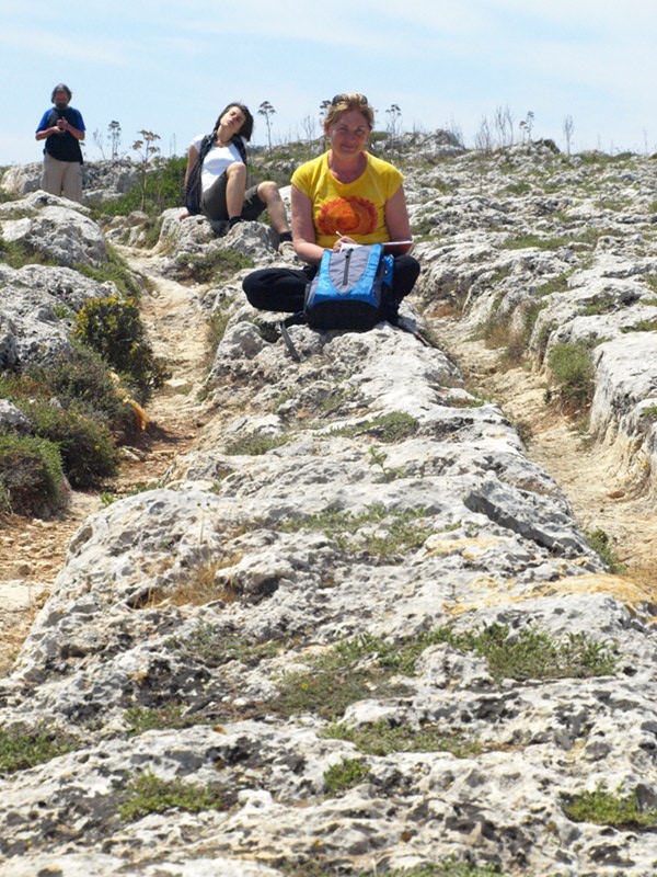 Ostatní přátelé, účastníci naší výpravy, poposedávají většinou na různých dalších místech kolejí kolem mě. Někdo sedí, někdo leží, všichni jsou tak zvláštně zasnění. Je to magické místo, jedno z mála, kde ještě jsou koleje tak znatelné. Mnohá jiná místa těchto starodávných souvislostí na Maltě jsou již zastavěná, či nějak porušená.